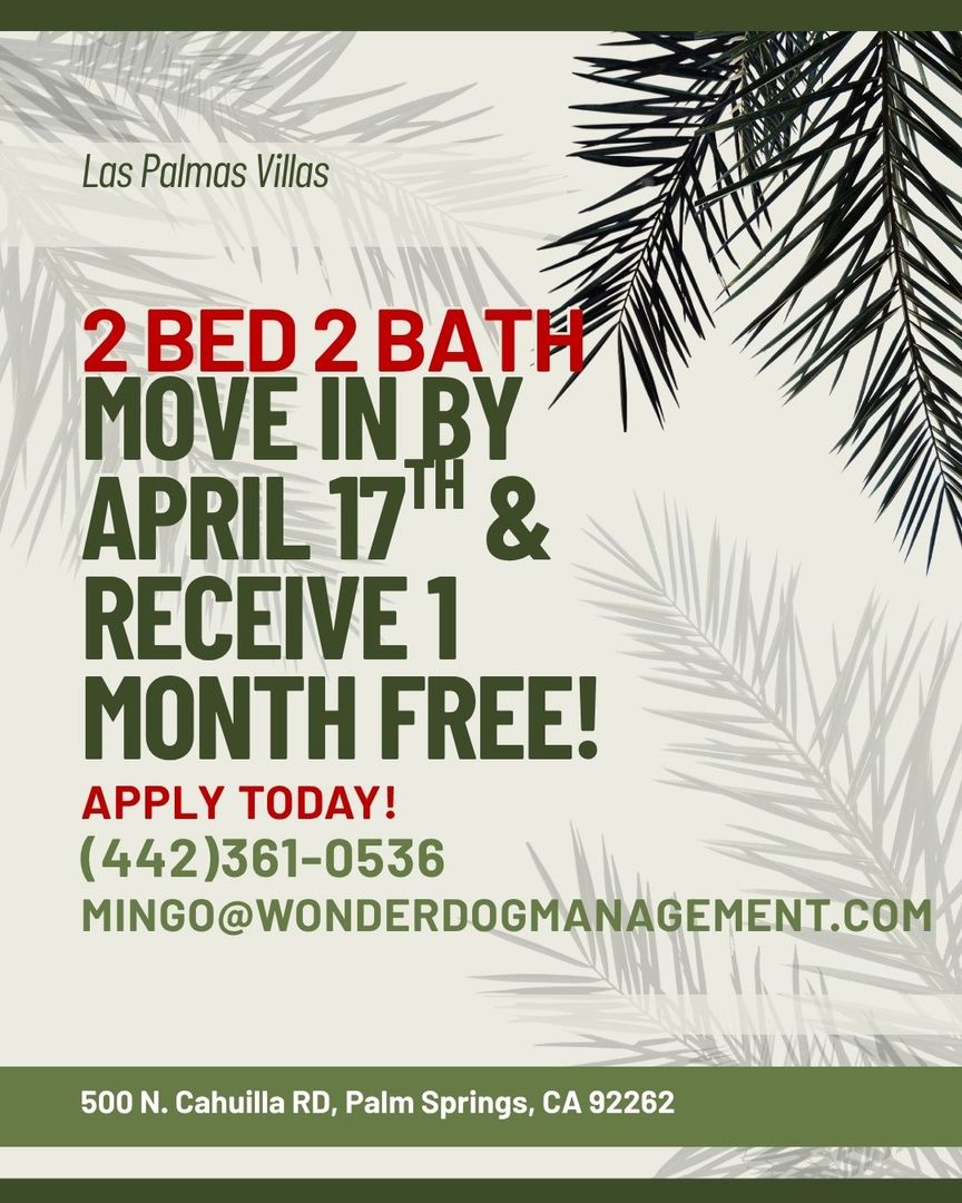 Now Leasing a 2 Bed 2 Bath in the heart of Palm Springs! Move in by April 17th & Receive 1 MONTH FREE!